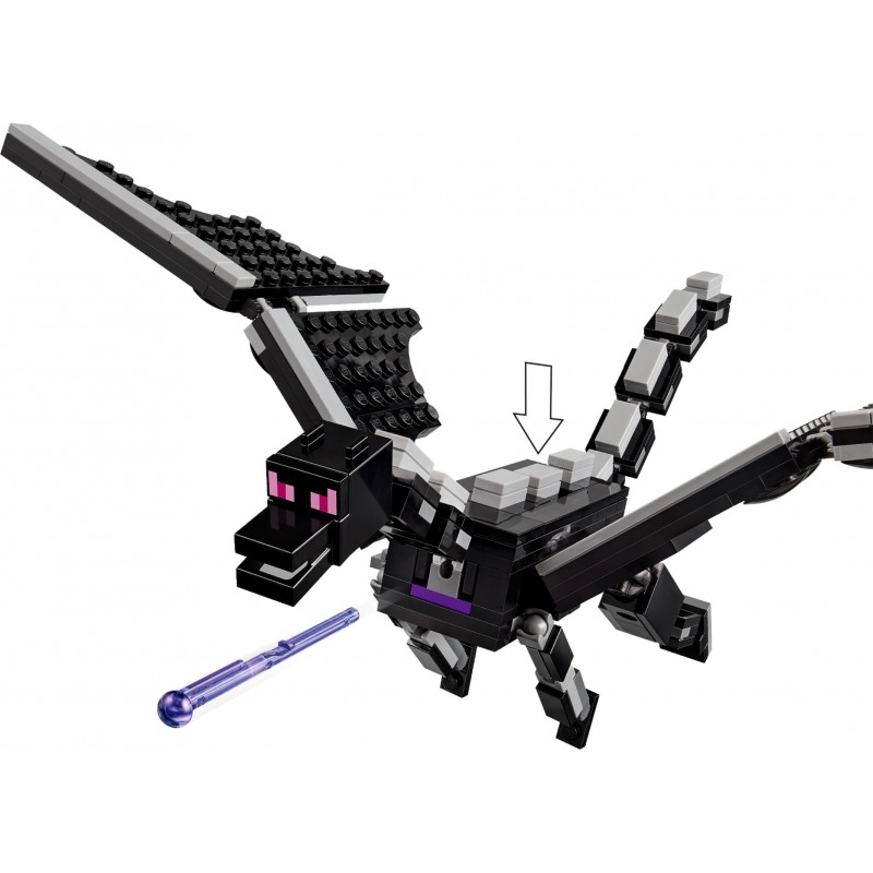 Hráči vstoupí do nebezpečného biomu End, kde se musí postavit drakovi z Enderu. Všechny končetiny této figurky s klouby jsou pohyblivé a upravitelné. Loď z Endu má plně vybavený interiér, do kterého vstoupíte skrz zvedací střechu a otevírací boční strany. Dračí hlavu z přídě lze odejmout a nosit ji jako přilbu. Uvnitř děti najdou varný stojan s lektvary zdraví. Mezi postavy z Minecraftu najdete průzkumníka Enderu s krovkami a ohňostrojovou raketou, rytíř zEnderu, Shulker a Enderman. Součástí je také cenné dračí vejce. Více digitální zábavy si stavitelé užijí s interaktivní aplikací LEGO® Builder, ve které mohou přibližovat a otáčet modely ve 3D a sledovat svůj pokrok.