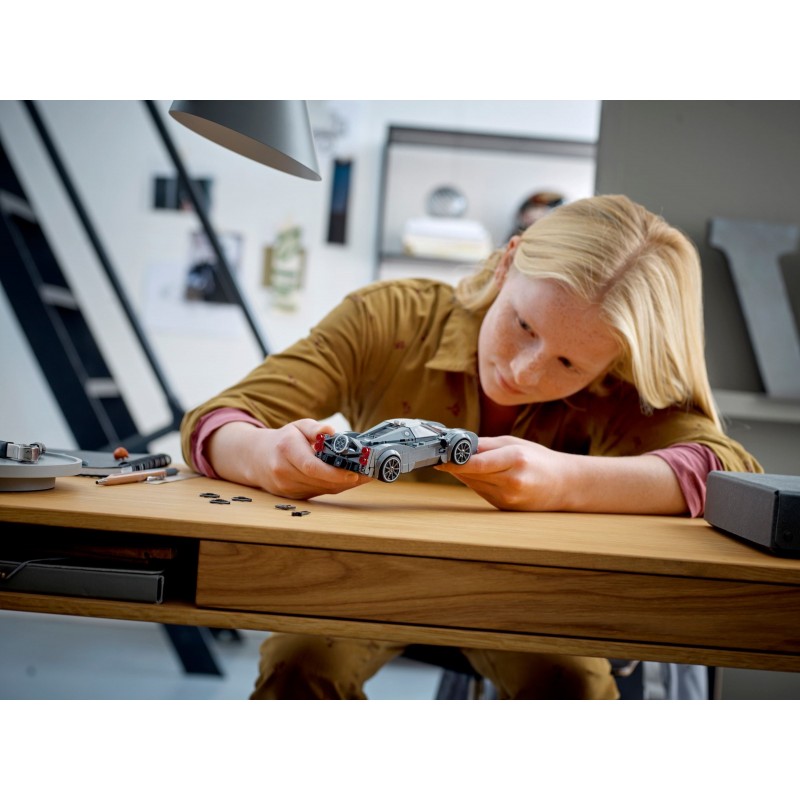 Objevte autentické prvky sběratelského modelu hyperauta Pagani: typický výfuk se čtyřmi koncovkami, zvlněná karoserie, široká přední maska, podběhy kol a motor pod sklem. Součástí stavebnice je také minifigurka řidiče, kterou lze umístit do kokpitu a vydat se s ní na dobrodružné závody.