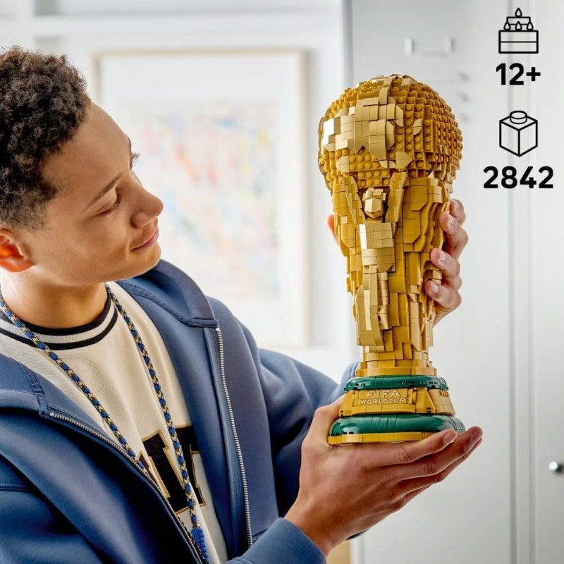 Probuďte v sobě kreativního šampióna s stavebnicí LEGO® Editions Oficiální trofej Mistrovství světa ve fotbale (43020) pro fotbalové fanoušky od 12 let. Sportovní hvězdy od 12 let si užijí spoustu zábavy při stavění repliky trofeje Mistrovství světa ve fotbale z kostek LEGO a zkoumání jejích autentických detailů. Model zobrazuje dvě lidské postavy zachycené v pohybu, které drží nad hlavami zeměkouli, ikonický globus. Ve spodní části najdete cedulku se jmény předcházejících vítězů Mistrovství světa ve fotbale. Horní část trofeje LEGO lze otevřít a odhalit tak minifigurku s logem Mistrovství světa ve fotbale 2026, která drží miniaturní trofej, a pozadí s logem Mistrovství světa ve fotbale 2026. Miniaturní scénu lze ponechat uvnitř trofeje nebo ji můžete vyjmout a vystavit vedle ní. Jakmile je model hotov, poslouží jako úžasná fotbalová dekorace a skvělý dárek k narozeninám nebo k jakékoli jiné příležitosti pro kluky, holky a sportovní fanoušky všech věkových kategorií. Je rovněž k dispozici v digitální podobě v aplikaci LEGO Builder, kde děti můžou sledovat svůj pokrok ve stavění a otáčet modely. Stavebnice obsahuje 2 842 dílků.